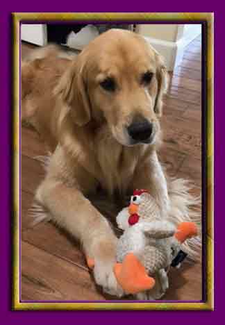 her toys, and she can often be found lying “froggy-doggy” with one in